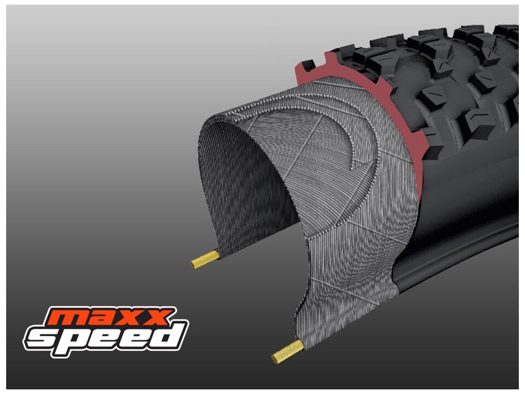 Zupełnie nowa mieszanka MaxxSpeed jest niewątpliwie jedną z najbardziej zaawansowanych mieszanek do wyścigów XC. Ta wysokowydajna mieszanka krzemionkowa znacznie zmniejsza opory toczenia, jednocześnie poprawiając przyczepność na mokrych nawierzchniach. W porównaniu z 3C MaxxSpeed, testy laboratoryjne wykazują znaczną redukcję oporów toczenia o około 25% (przy niezmienionym wzorze bieżnika, strukturze opony i ciśnieniu powietrza). Teoretycznie może to oznaczać oszczędność nawet jednej minuty w 90-minutowym wyścigu.