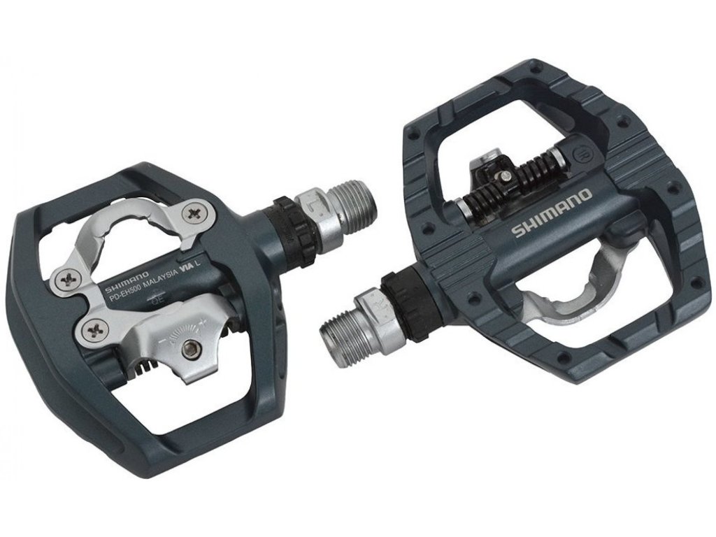 Pedały szosowe SPD PDEH500 nadają się do jazdy rekreacyjnej i turystycznej. Pedały z jednostronną blokadą SPD i płaską platformą z bolcami po drugiej stronie. Możliwość regulacji napięcia wstępnego siły blokady w celu zaciskania i wypinania buta. W zestawie bloki SM-SH56 do wielokierunkowego wypinania buta. Typ: UNI, Waga całkowita opakowania: 383 g, Zastosowanie: SZOSOWE/FHB, jednostronne, SPD, ciemnoszare, z blokami SM-SH51, Materiał: korpus pedału (aluminium), oś (chrom + stal)