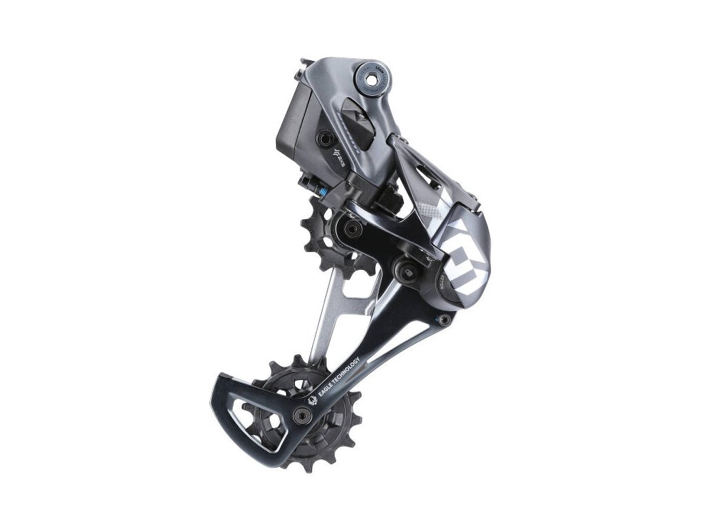 Tylna przerzutka X01 Eagle AXS to serce grupy Vector i została specjalnie opracowana z myślą o optymalnej zmianie przełożeń z silnikiem elektrycznym. Zmiana przełożeń pod obciążeniem i na nierównym terenie jest teraz jeszcze bardziej precyzyjna. Daje to jeszcze większą pewność prowadzenia roweru w ekstremalnych warunkach i pozwala skupić się wyłącznie na trasie. Nowe ogniwo przeciążeniowe zapewnia lepszą ochronę tylnej przerzutki w razie upadku. Przy ekstremalnych obciążeniach, tymczasowo rozłącza tylną przerzutkę, aby uniknąć obciążenia, a silnik elektryczny jest chroniony przed uszkodzeniem. Jednakże, tylna przerzutka natychmiast powraca do przełożeń. Pozytywnym efektem ubocznym jest lepsza ochrona tylnej przerzutki w razie upadku. Dodatkowo, krótsze o 10 mm ramię tylnej przerzutki chroni ją przed kontaktem z podłożem. Dla lepszego opasania łańcucha, a tym samym lepszej zmiany przełożeń, równoległobok został przesunięty nieco do przodu.