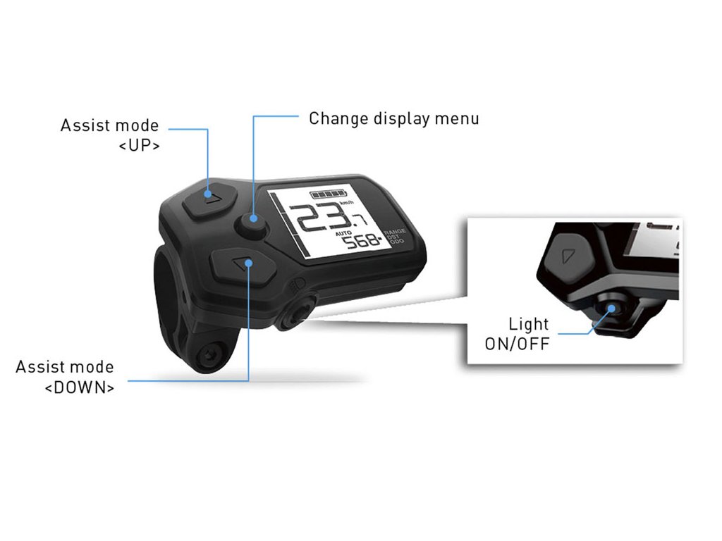 Funkcje: podświetlenie, wyświetlanie pomocy, prędkości, poziomu naładowania baterii, biegów, zasięgu, błędów