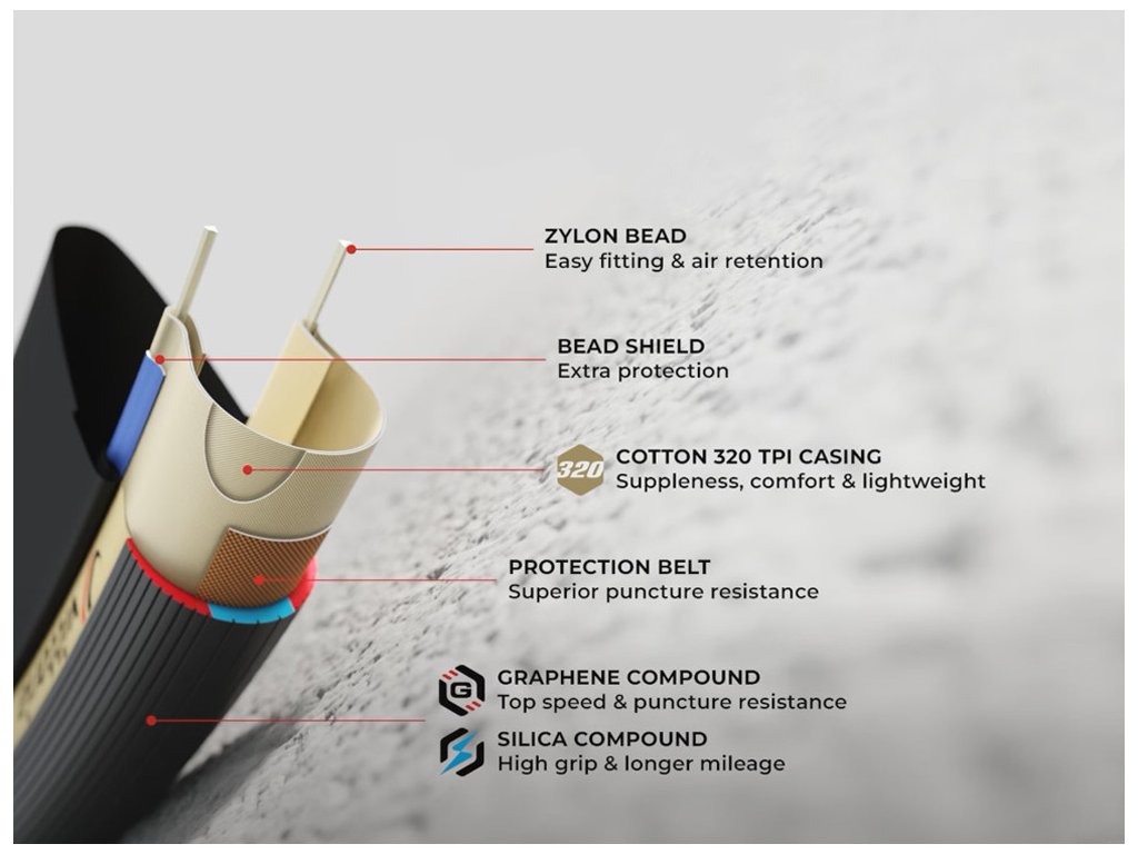 Prędkość, przyczepność na mokrej nawierzchni i w zakrętach, odporność na przebicia i komfort to prawdopodobnie najważniejsze ulepszenia w porównaniu z poprzednią wersją. Bawełniany karkas jest połączony z bieżnikiem opony za pomocą nowo opracowanego procesu elektrowulkanizacji, dzięki czemu opona jest w 100% bezszwowa. Rezultatem jest jeszcze bardziej elastyczna, aerodynamiczna i niezawodna konstrukcja. Opona jest niezwykle trwała dzięki ochronie przed przebiciem na bieżniku i stopce (Bead Shield). Dodatkowo, na oponie znajduje się kod QR z ważnymi informacjami o oponie.