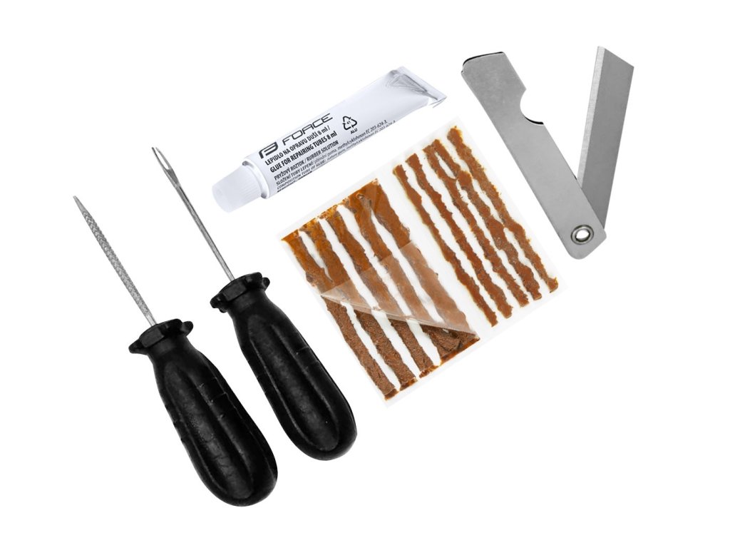 Zestaw naprawczy FORCE do opon bezdętkowych z narzędziami. Zawiera: 1 x igła czyszcząca - czarny uchwyt (średnica 4 mm x długość 100 mm) 1 x igła do nawlekania - czarny uchwyt (średnica 4 mm x długość 100 mm) 5 x knot klejący - brązowy (średnica 1,5 mm, długość 50 mm) 5 x knot klejący - brązowy (średnica 3,5 mm, długość 50 mm) 1 x tubka kleju 8 ml 1 x cienki nóż 1 x instrukcja obsługi Waga pudełka: 64 g sprzedaż i pakowanie w pudełku zestawu FORCE (wymiary: 140 x 55 x 22 mm)